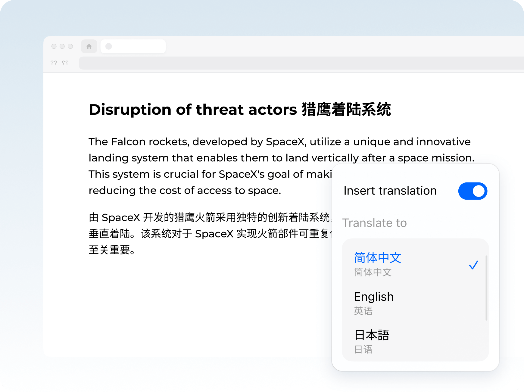 在桌面上的各个应用中,轻松一划选中文字后就能为你提供 AI 搜索、翻译、解释、总结等各类 AI 辅助功能。